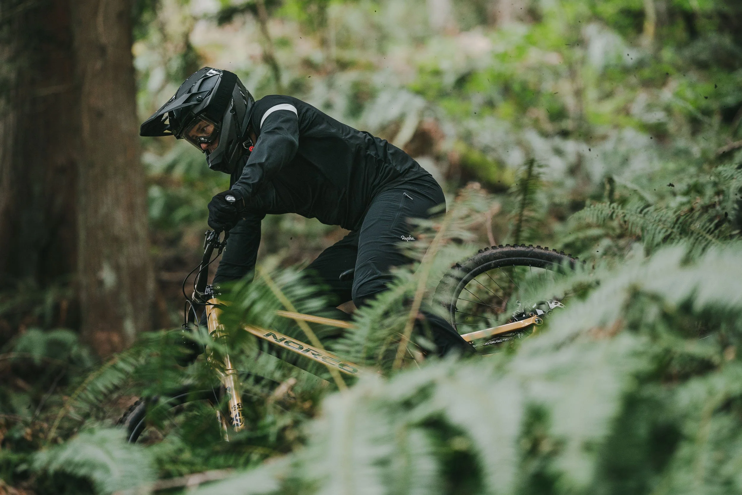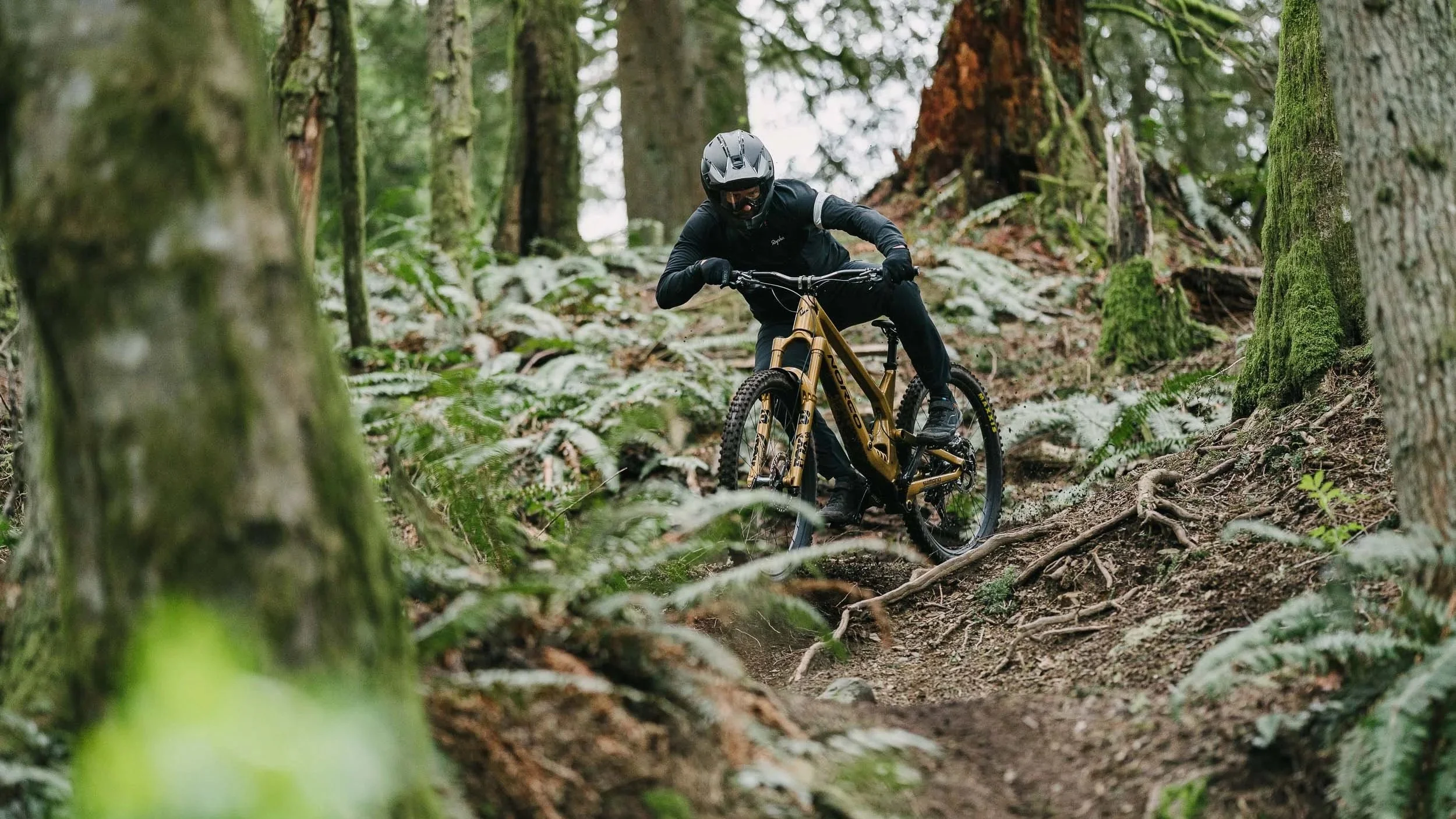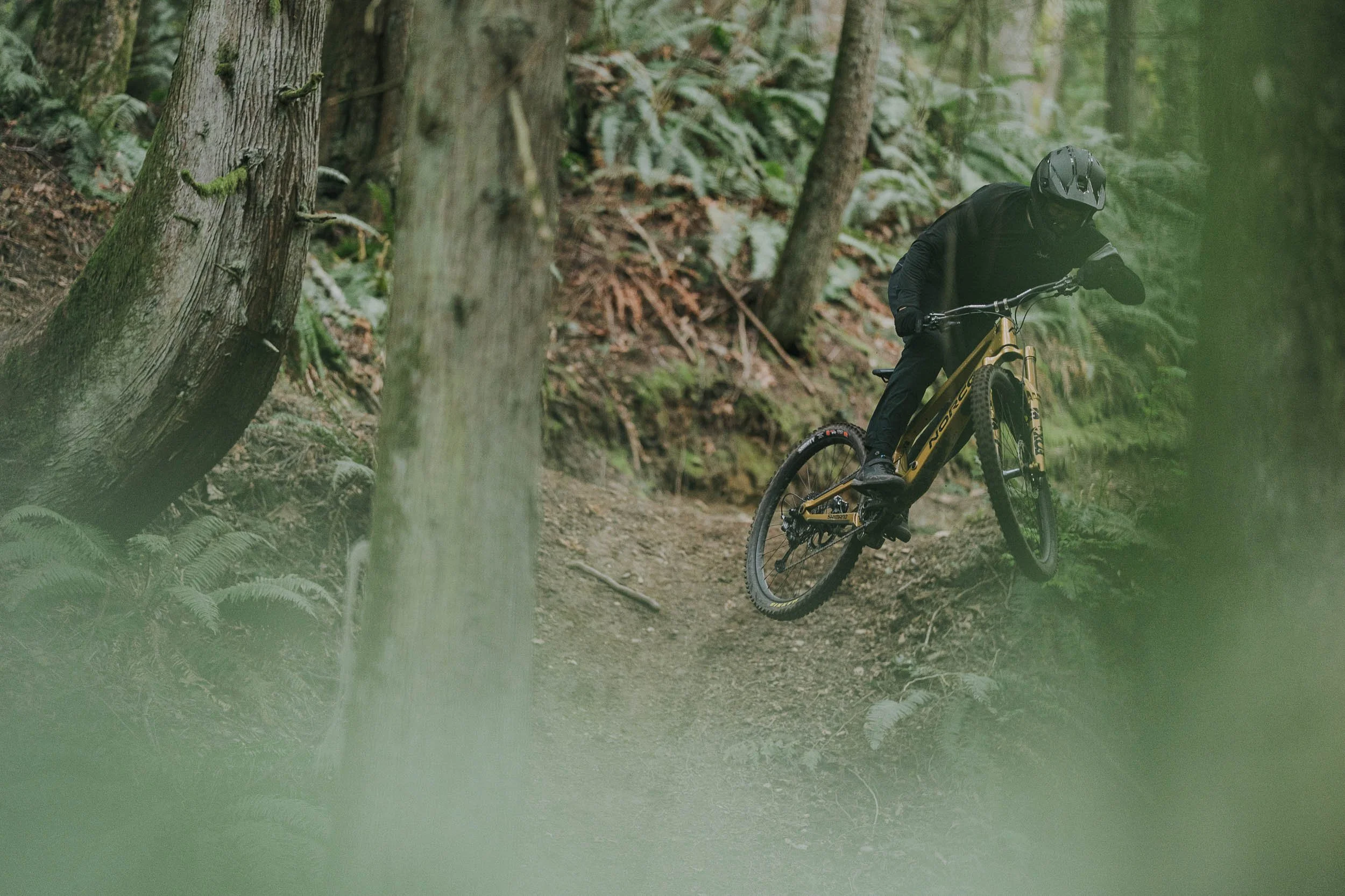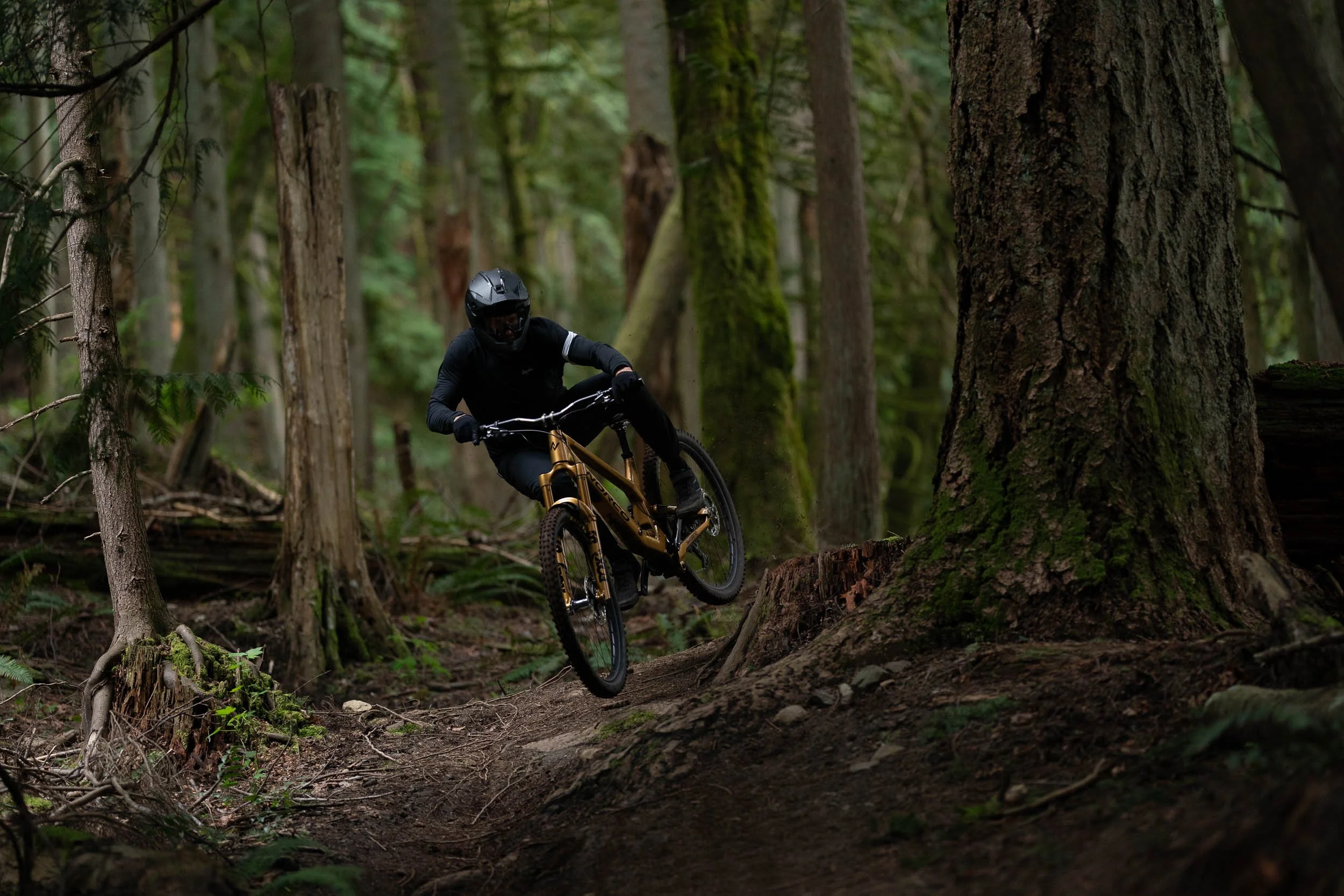 Atkinson rode a custom gold Norco Range built for the project, its unmistakable finish cutting through the dark greens of the forest. The result is a visual study of control and rhythm, where rider, bike, and terrain move as a single system.