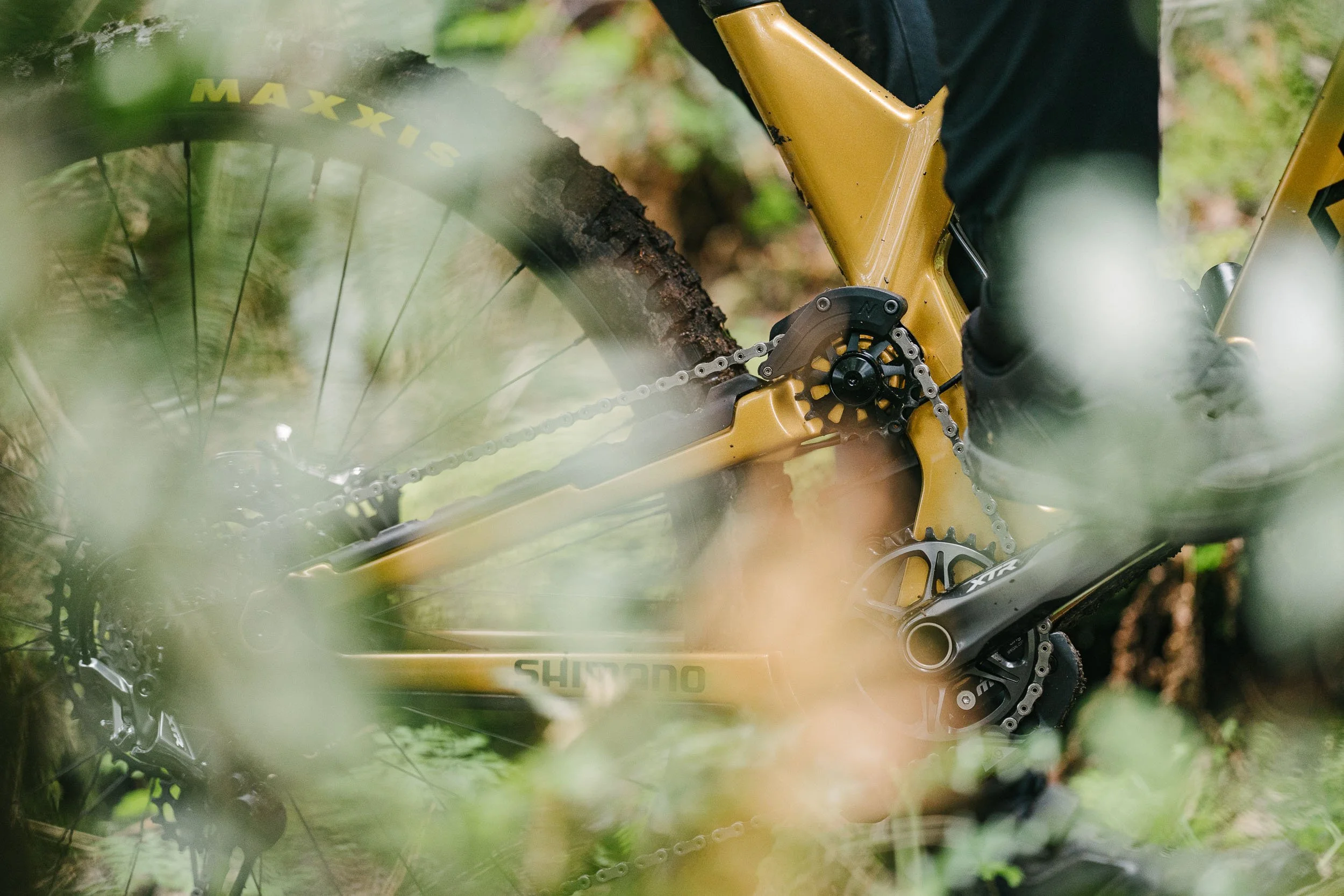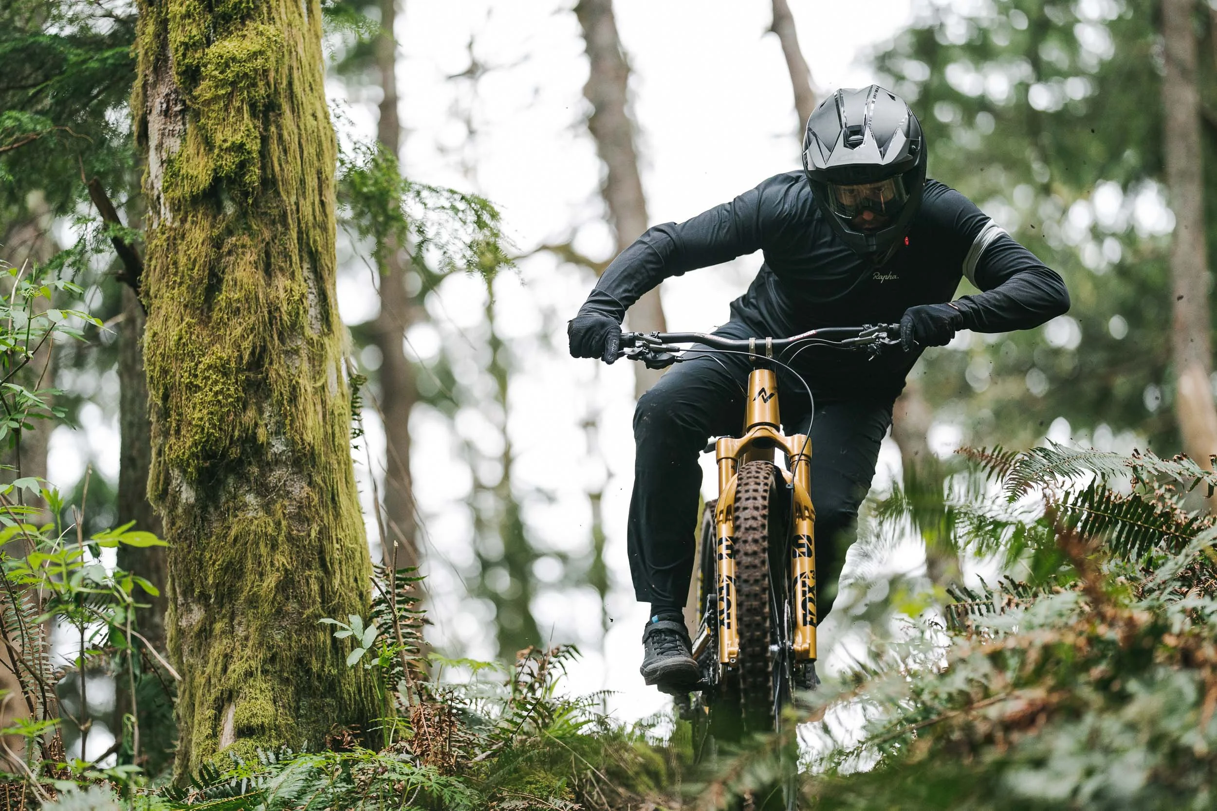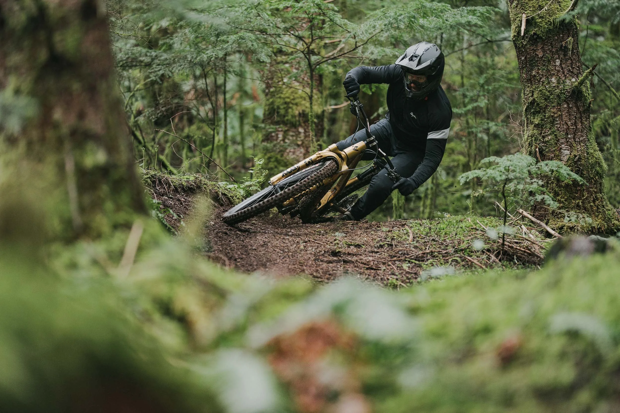 Atkinson rode a custom gold Norco Range built for the project, its unmistakable finish cutting through the dark greens of the forest. The result is a visual study of control and rhythm, where rider, bike, and terrain move as a single system.
