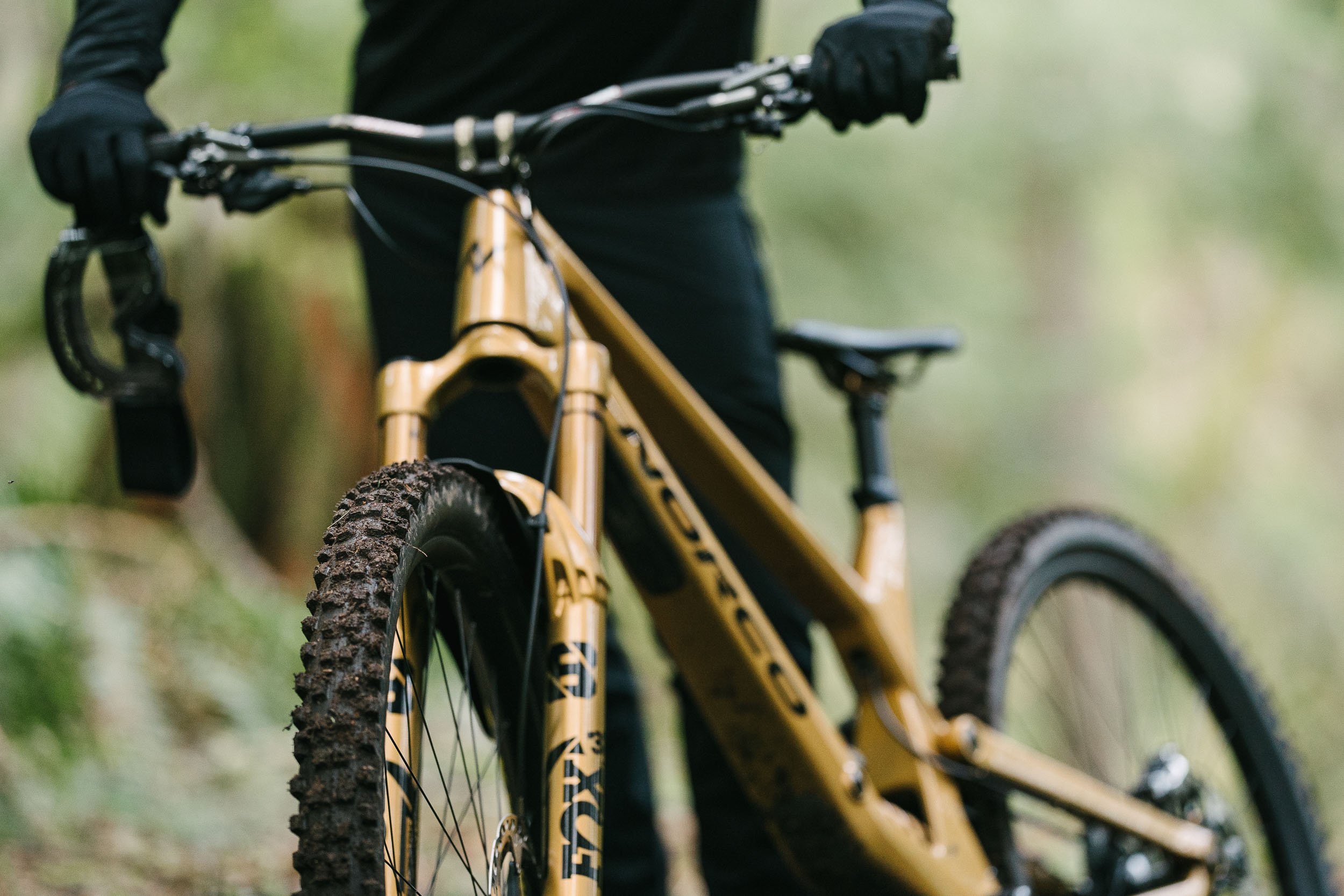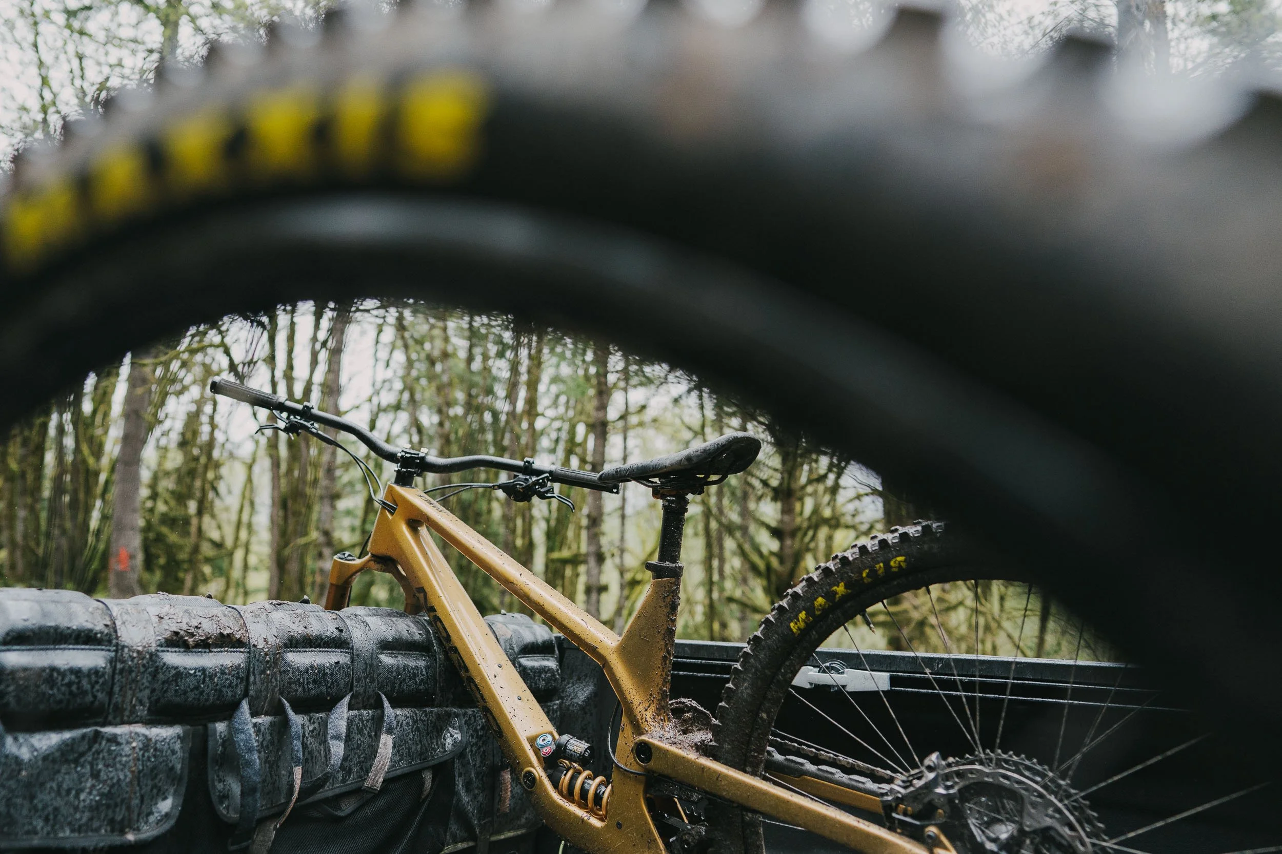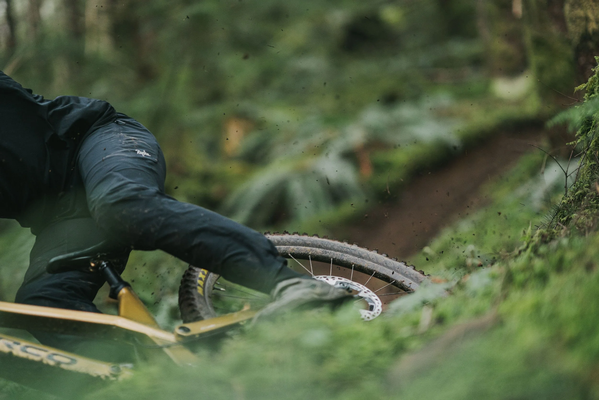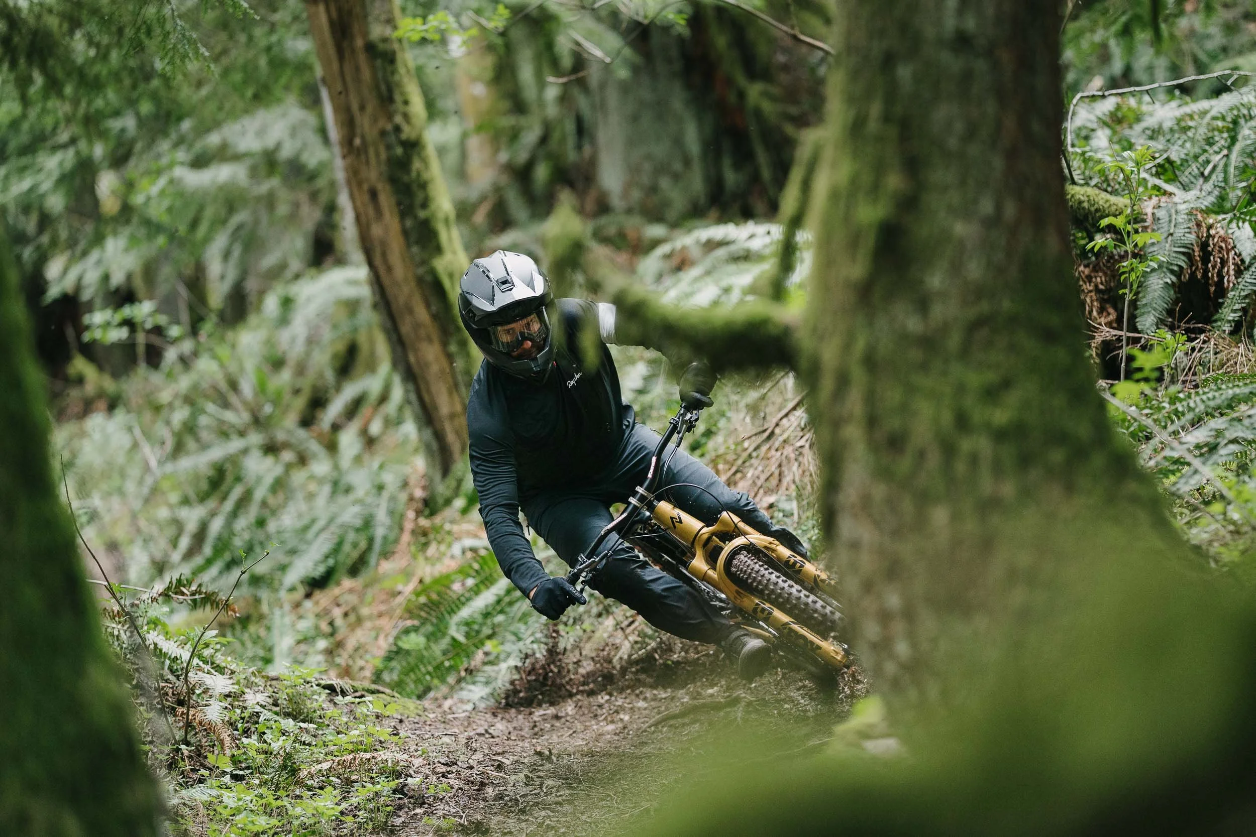 Atkinson rode a custom gold Norco Range built for the project, its unmistakable finish cutting through the dark greens of the forest. The result is a visual study of control and rhythm, where rider, bike, and terrain move as a single system.